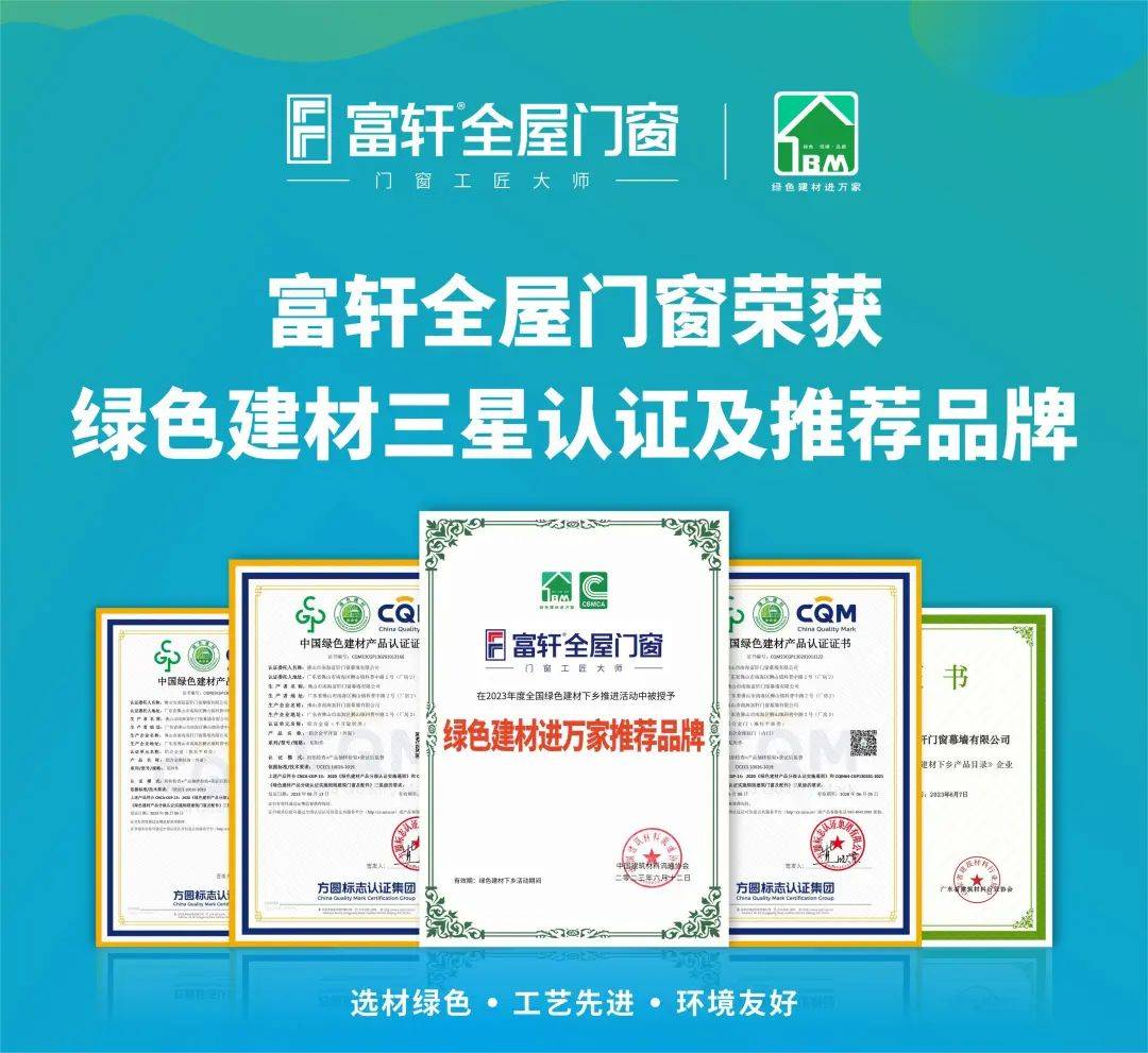 好门窗助力好生活。富轩全屋门窗积极参与“绿色建材进万家”活动,致力于将绿色建材推广至千家万户。线下1000+销售网点,用绿色节能门窗服务千家万户,被中国质量认证中心和红星美凯龙认定为“家居绿色环保推荐品牌”。致力于让每个家庭都能享受到绿色、舒适、安全的家居环境,以实际行动推动家居生活绿色转型。