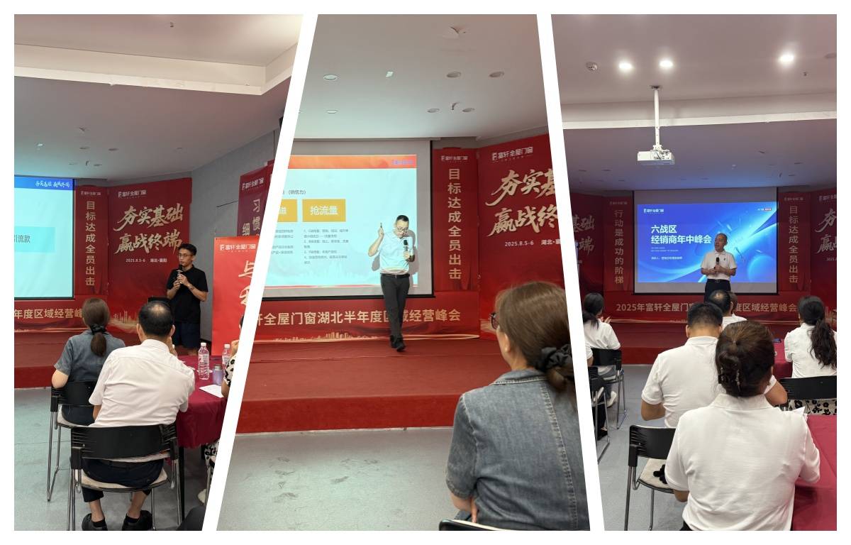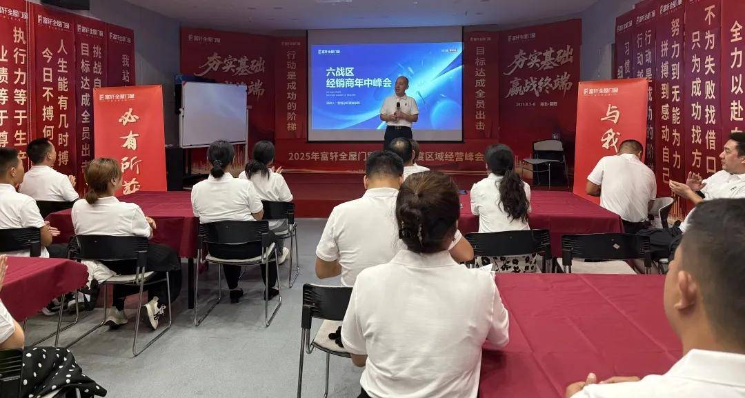 在峰会高涨的氛围中,富轩全屋门窗营销总经理翁总就集团总部2025下半年战略规划及发展愿景,为湖北战区下半年发展指明前进方向,增强了经销商伙伴的信心与精神动力;次日,翁总与经销商伙伴开展终端赋能座谈会,深入交流,切实为经销商伙伴提升安装交付安全性和门店服务力而提出解决方案,支持终端业务开展。