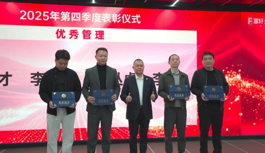 为树立榜样,激励奋进,大会特别开展2025年度第四季度表彰仪式。富轩集团董事长李董与营销总经理翁总共同为表现优异的管理者和员工颁发荣誉奖项。