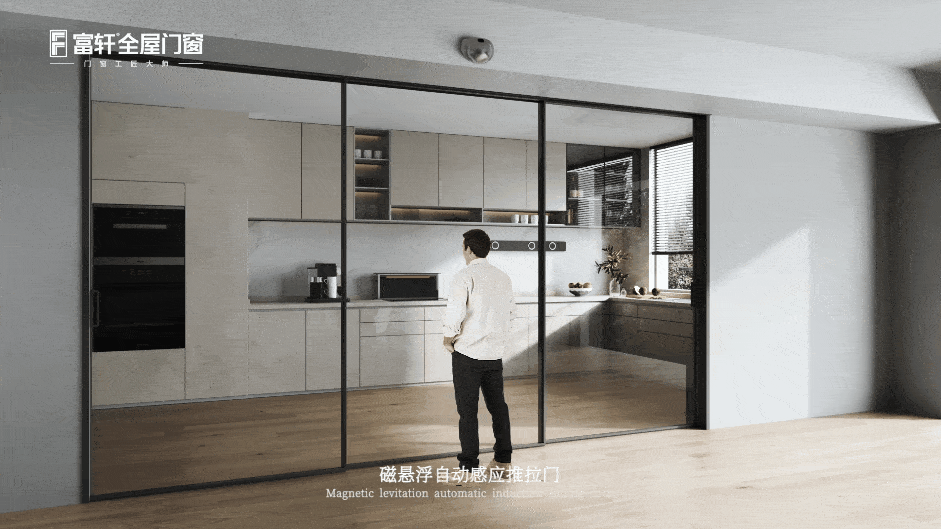 家里的隔断可以选择用玻璃材质的,在视觉上可以提供更大的通透感。如果是厨房隔断的话,可以选择富轩全屋门窗磁悬浮自动感应推拉门,大面积玻璃+智能红外感应开关+无地轨设计,充分解放双手,人走到门前自动感应识别开关,出入自如。