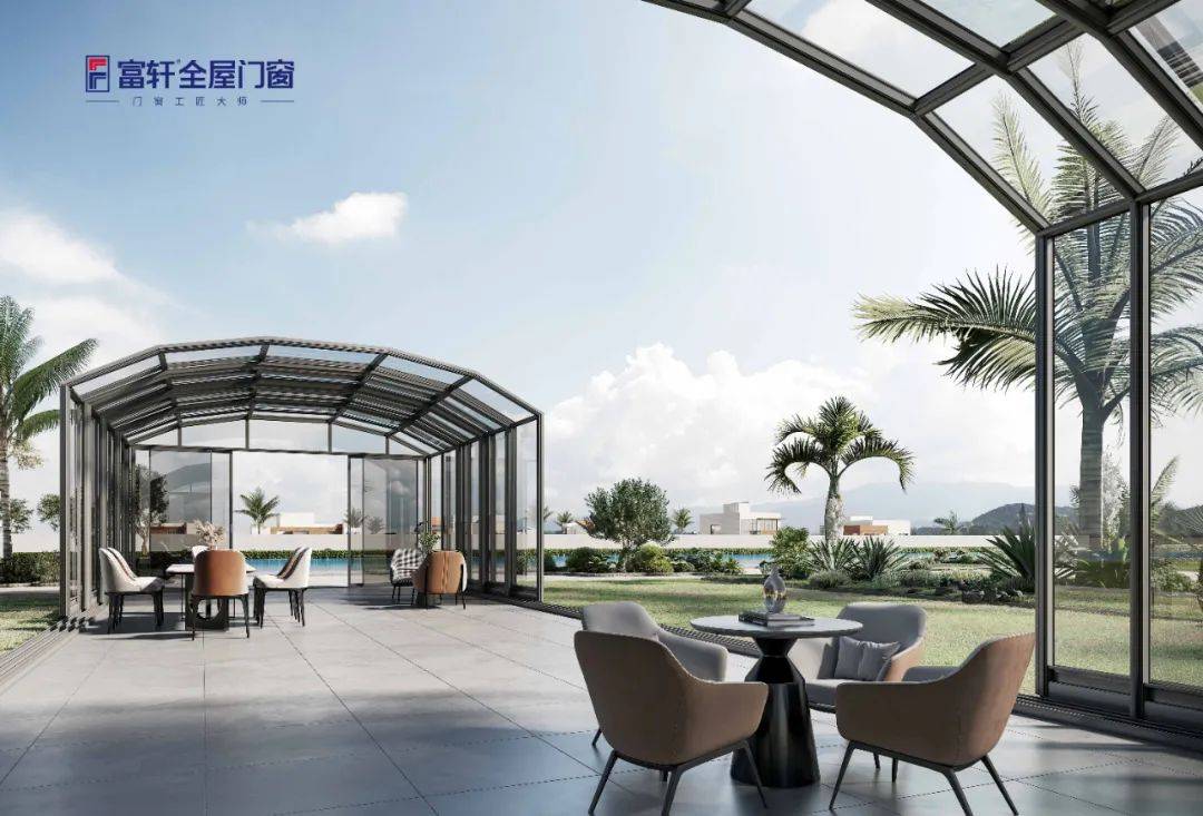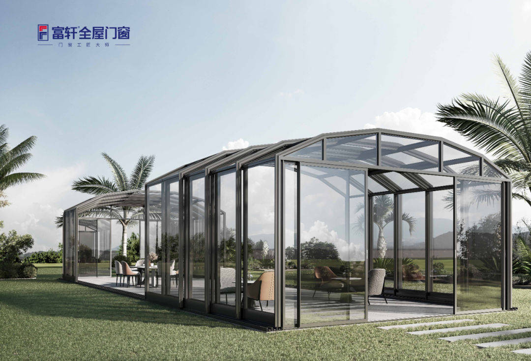 富轩全屋门窗移动阳光房可以根据需要,开启或关闭阳光房的棚顶、墙壁或窗户,控制阳光进入室内的面积,以调节室内温度,创造一个温度适宜的环境,不论寒暑秋冬,这里就是春天,俯仰之间纳人生万象。