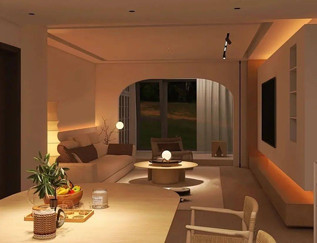 好的光线布局既能提升空间感,也能为客厅营造出不同的气氛。客厅里可采用无主灯设计,以落地灯、射灯、壁灯或者是吸顶灯组合代替,形成层次丰富的照明效果,让有限的布局呈现出立体感,扩大视觉空间。