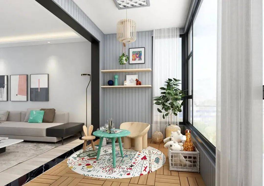 阳台可以改造成亲子天地,集绘画区、阅读区、娱乐区为一体,为孩子打造一个温暖明亮、被阳光包围的亲子空间,家长可以与孩子在此欢度快乐时光,共享温暖阳光,留住美好的童年时光。