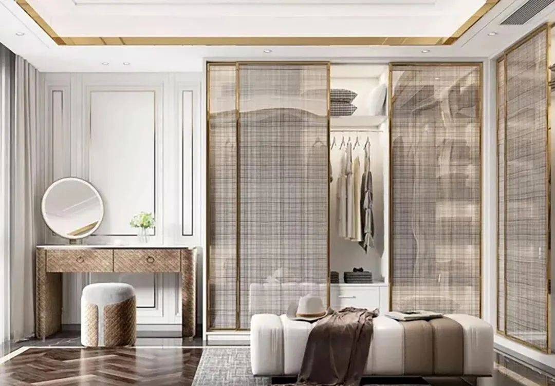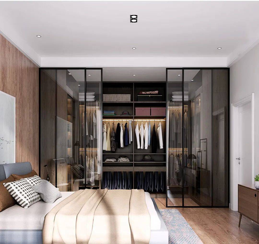 衣帽间装修可以选用窄边玻璃移门来改善采光,同时营造空间通透感、增强舒适度,拓宽视觉感及表现光影的和谐,晶莹通透、现代时尚、灵活易操作、且自带高级感,让时尚、轻奢成为空间的一大亮点。