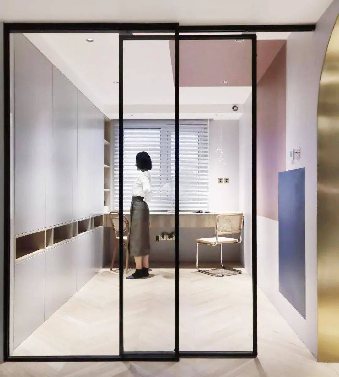 而窄边玻璃移门的玻璃材质具有很高级的质感,应用在非承重墙的墙面,可以让大空间显得更加高端大气、小空间显得更加宽敞通透。与普通的木门相比,玻璃移门还不用担心板材甲醛超标的问题。