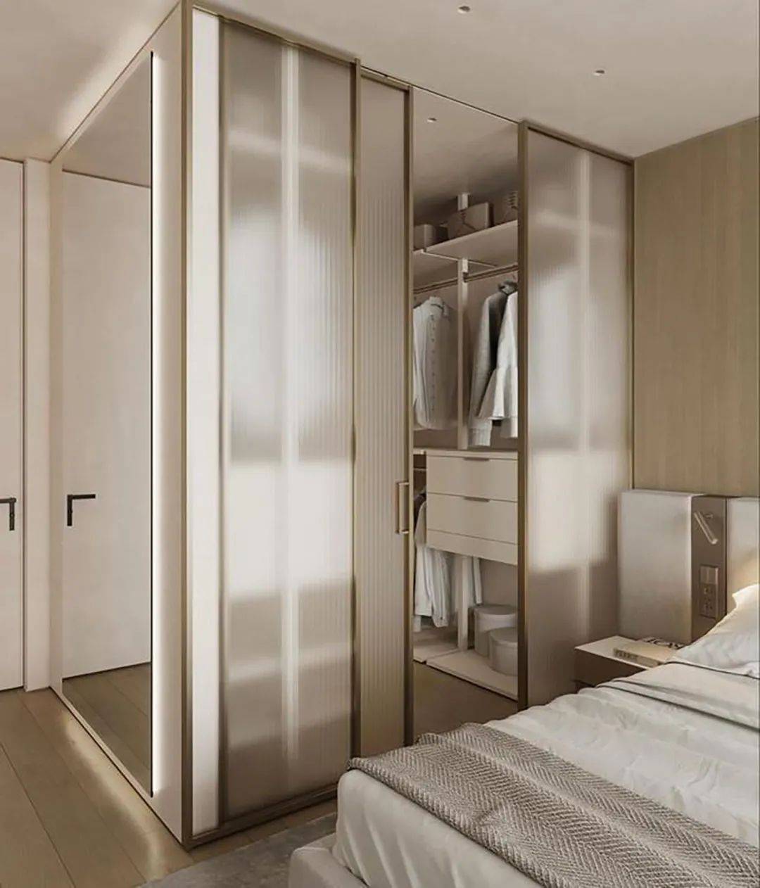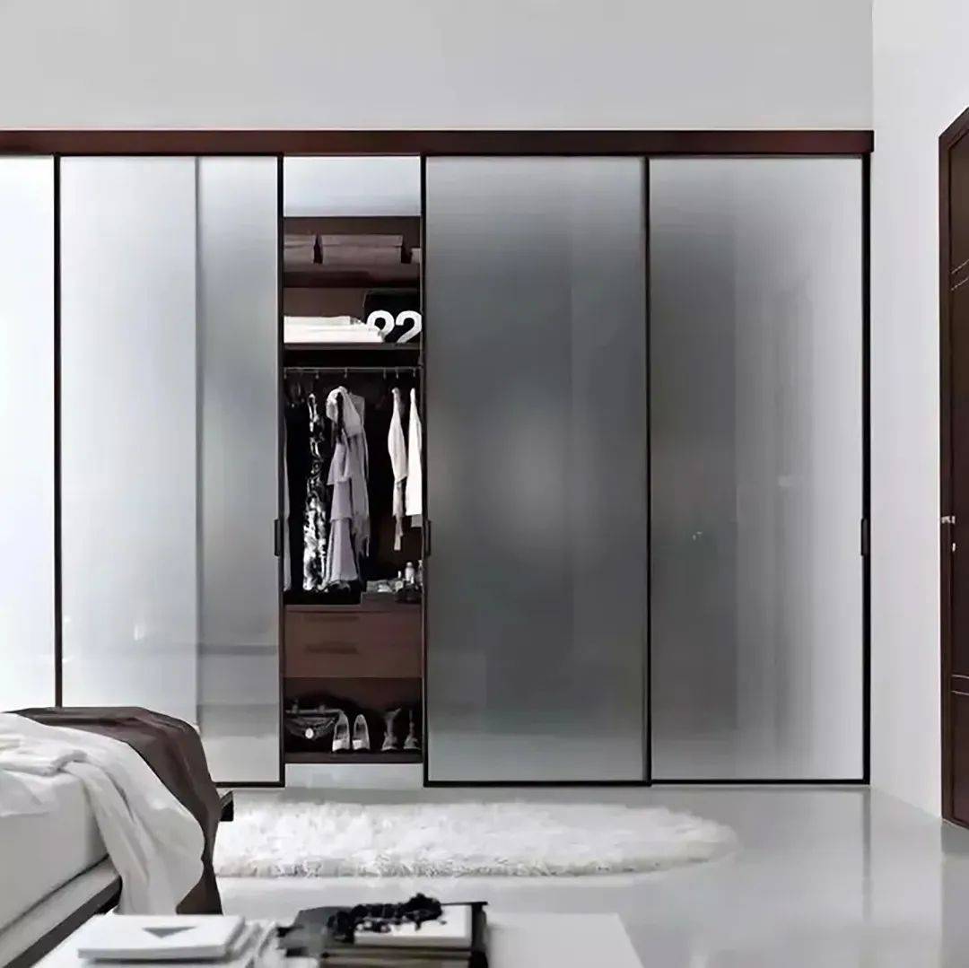 磨砂玻璃的移门因为表面的材质,隐私感比较好,形成较为独立的空间,不会让衣物完全裸露,仿佛是一层忽隐忽现的薄雾轻纱,一道欲说还休的屏风,给人一种朦胧的美感。