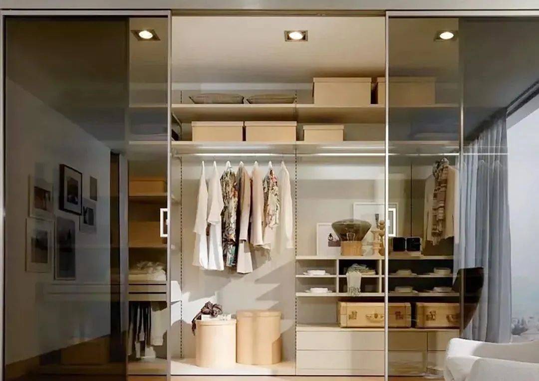 有些朋友可能会犹豫——玻璃移门的衣帽间会不会太透?衣服少的话还可以很整洁,但是衣服一多就会显得比较凌乱了,可以按需搭配玻璃类型,不仅能够很好地遮住后面的凌乱衣物,还能在视觉上显得更加高级时尚。