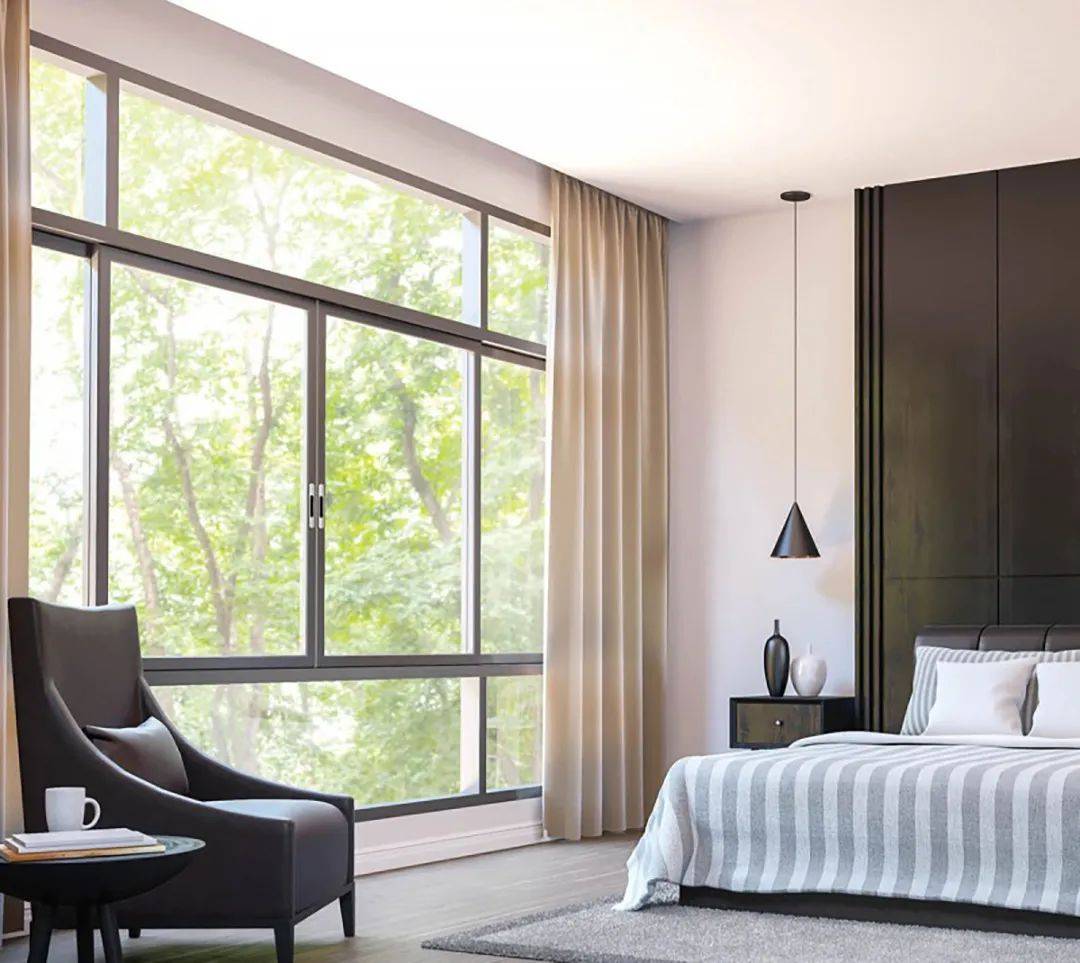 卧室要营造良好的睡眠环境,一定要保持安静舒适的环境。特别是房子靠近公路、商区的噪音会特别大,建议选择断桥铝+中空玻璃设计,形成全密封中空层,有效降低声波共振效应,阻隔声音传递,隔声效果非常好。