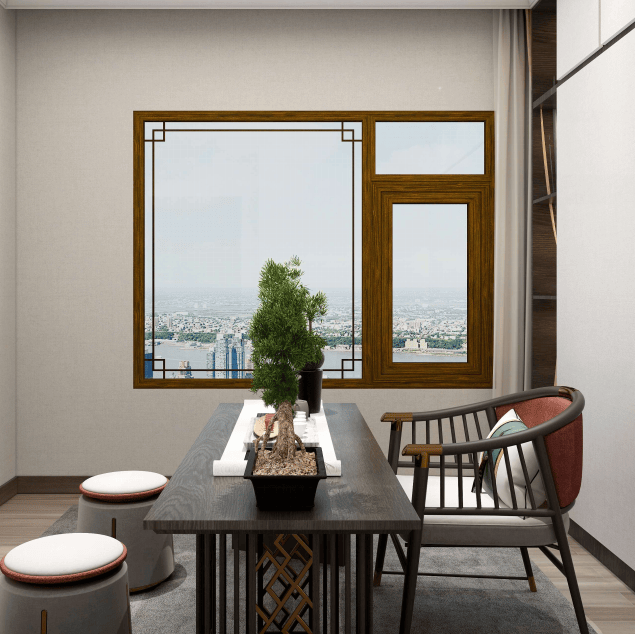 在风格定位上,可以选择简约或中式风格,营造宁静舒适的氛围。非常适合在“客厅+茶室”的空间中,装上富轩古韵轩窗纱一体窗,于方寸间尽享东方意境。