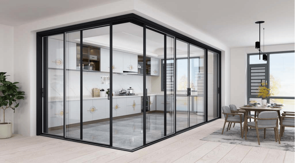 厨房采用半开放设计,增加空间通透感。担心油烟味跑进客厅的话,可以采用富轩富隐MT16百变推拉门或者极致艺术三代推拉门系列,开合之间尽享通透。