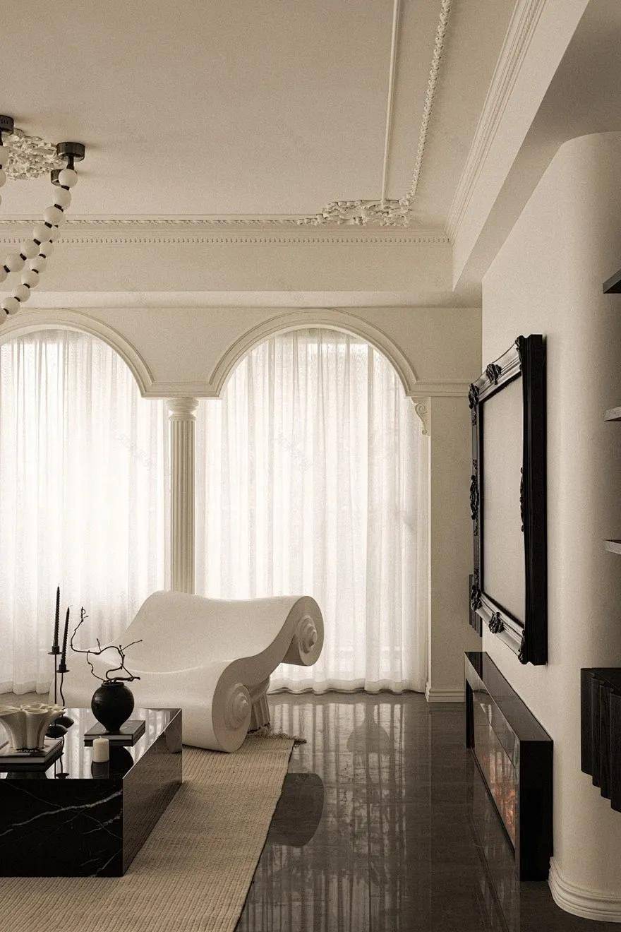 而法式门窗的灵魂,在于它能与“四季景观”完美融合。大落地窗能够自然地窗景自然衔接,顶部经典法式半圆形让整面窗户成为天然画卷。